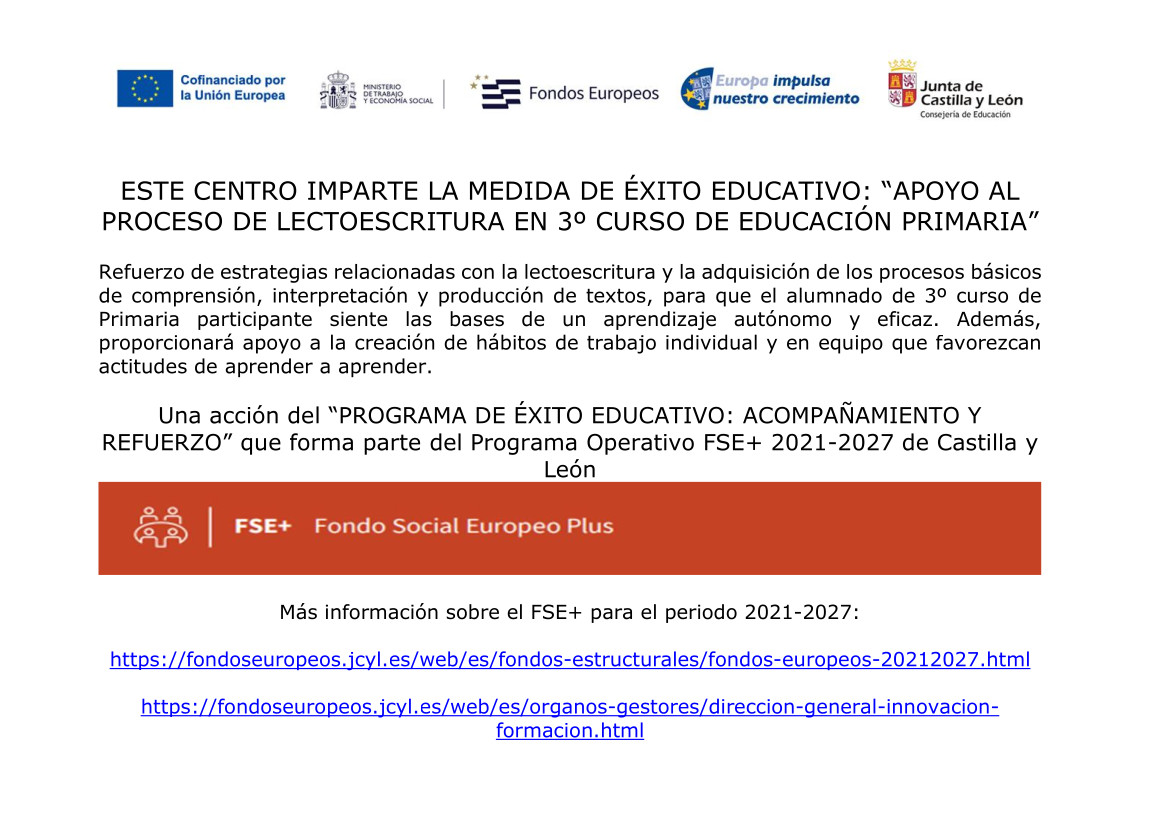 Dentro de este programa, destaca la medida de apoyo al proceso de lectoescritura en 3.º de Educación Primaria, dirigida al alumnado que presenta dificultades en comprensión lectora, expresión escrita u oralidad. Esta actuación se desarrolla a lo largo del curso escolar mediante actividades específicas orientadas a mejorar la comprensión, la interpretación y la producción de textos.