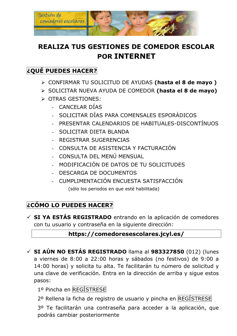 SOLICITUD VÍA INTERNET: los padres registrados deberán acceder a su solicitud entrando en la aplicación en la dirección https://comedoresescolares.jcyl.es/ y cumplimentado los datos requeridos siguiendo los pasos que se indican en la Guía de Ayudas a su disposición en la propia aplicación. La solicitud se confirmará y enviará telemáticamente junto con la documentación adjuntada y quedará a la espera de su validación por el centro. También podrá, a través de la aplicación, cumplimentar su solicitud en la aplicación, imprimirla y presentarla posteriormente en el centro junto con la documentación necesaria.