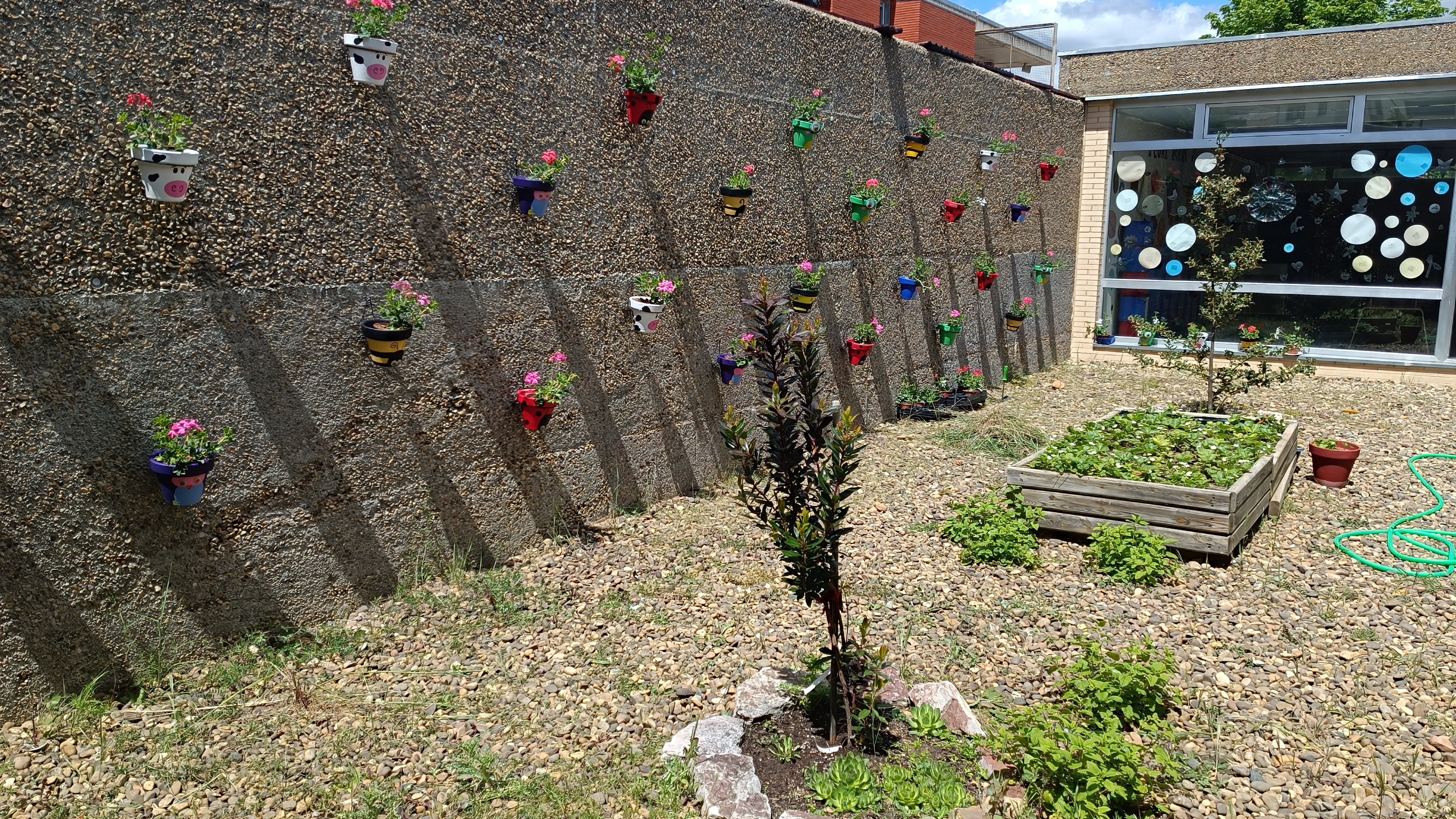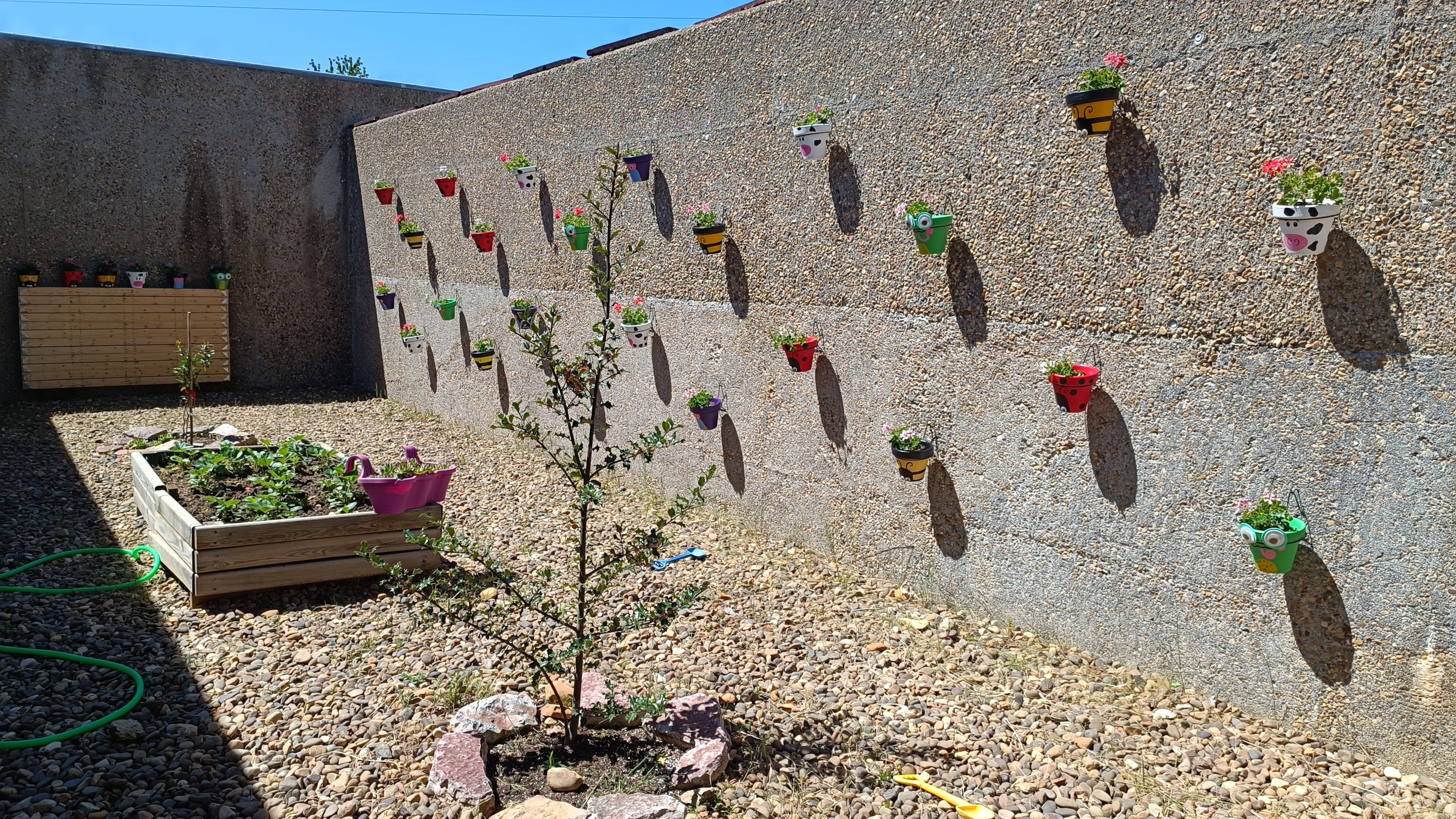 Se trata de un espacio lleno de plantas, árboles y elementos decorativos que crean un ambiente tranquilo y agradable, perfecto para desarrollar la educación medioambiental de manera práctica y vivencial.